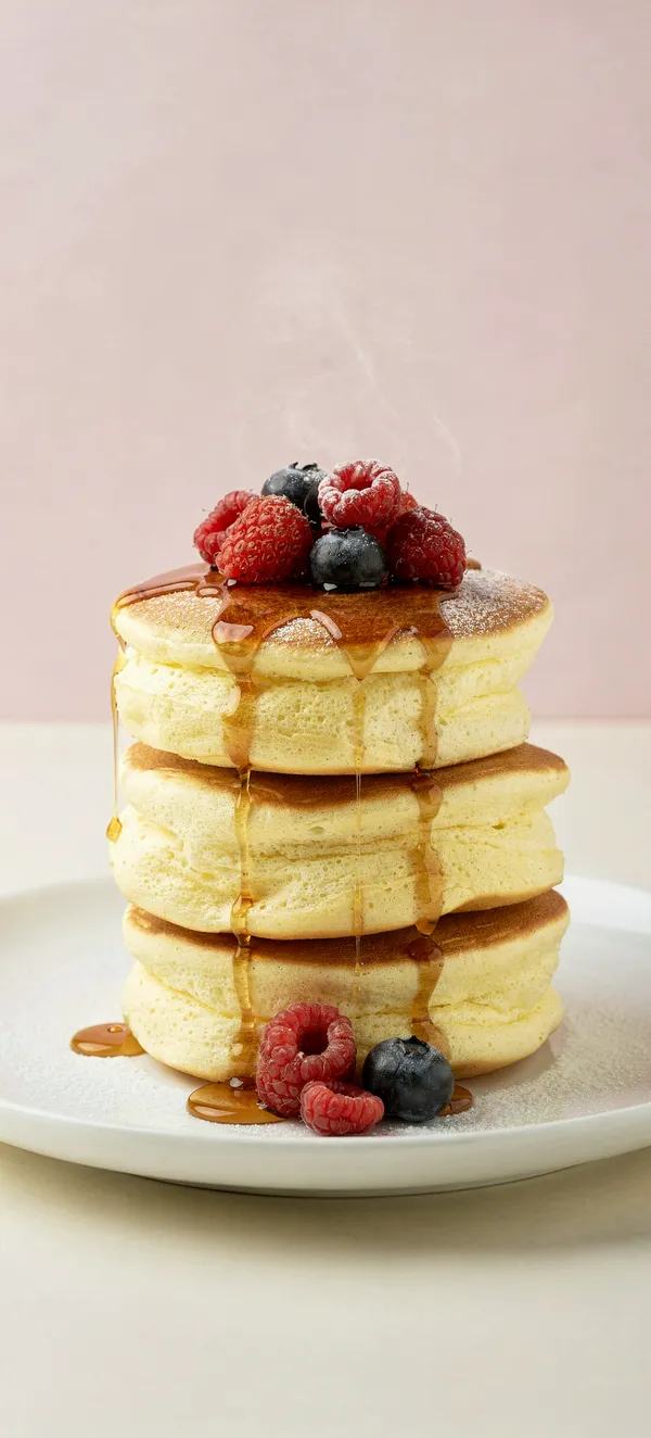 FoodIndulge in a mouthwatering 4K phone wallpaper featuring soft Japanese souffle pancakes with syrup and fresh berries on a minimalist pastel background.