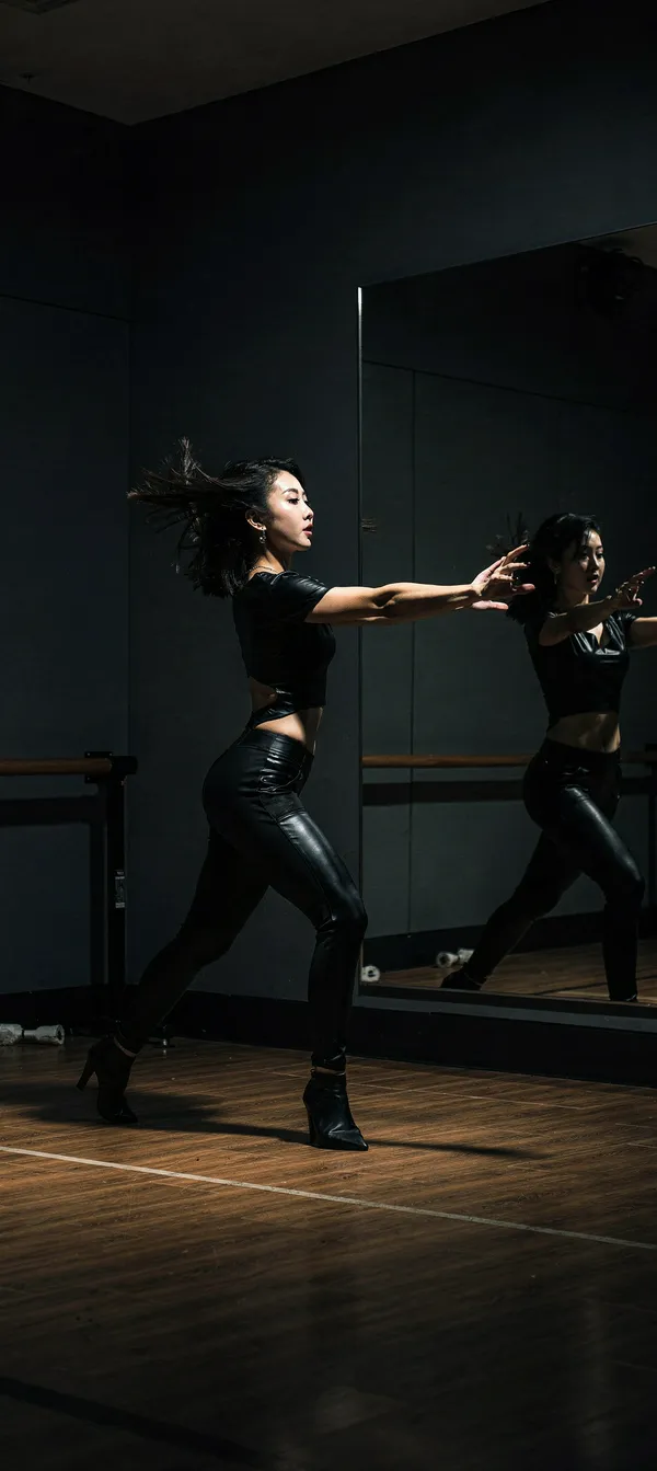 TrendingHigh-contrast, artistic wallpaper featuring a sleek K-pop dancer in a dramatic studio setting with mirror reflection and chiaroscuro lighting. Premium HD quality.
