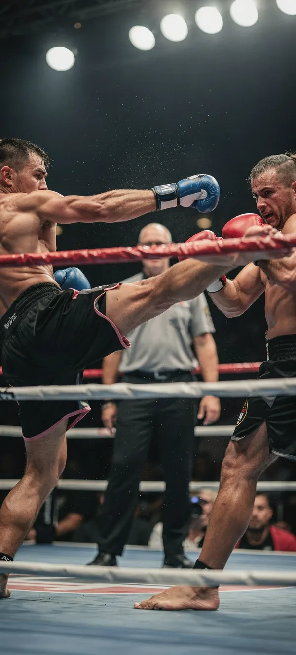 SportsHigh-intensity kickboxing wallpaper featuring a powerful spinning back kick technique. Ultra-sharp 4K sports action image capturing martial arts dynamic movement.