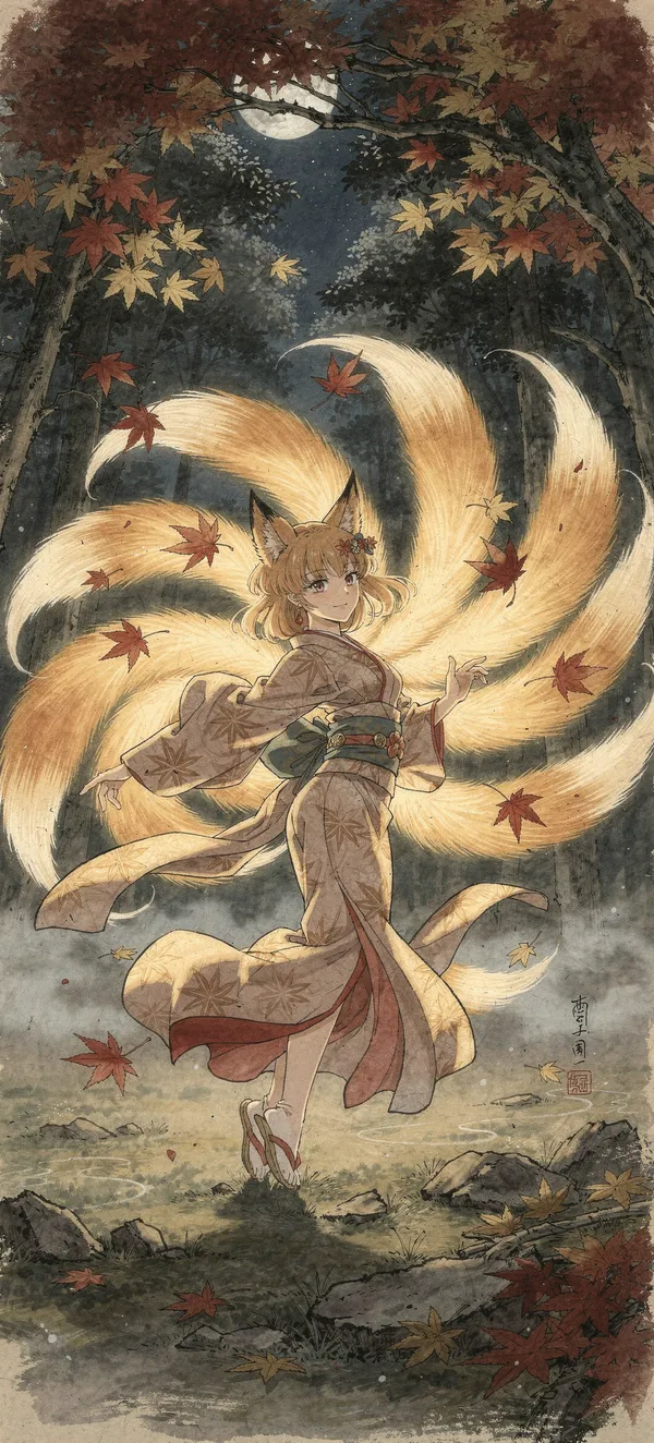 AnimeStunning traditional anime artwork featuring a magical nine-tailed fox spirit dancing amid vibrant autumn maple leaves. High-resolution Japanese art wallpaper.