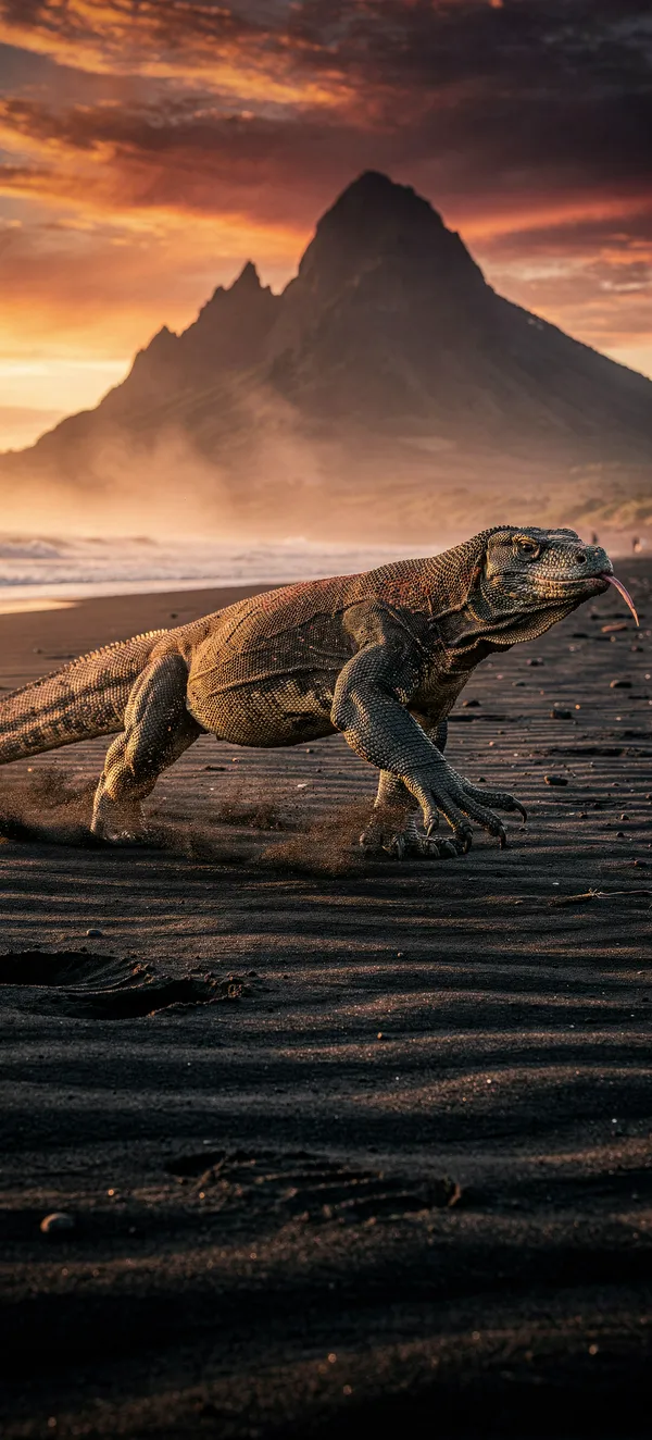 AnimalsStunning high-resolution mobile wallpaper featuring a majestic komodo dragon on a dramatic volcanic black sand beach at golden sunset with cinematic detail.