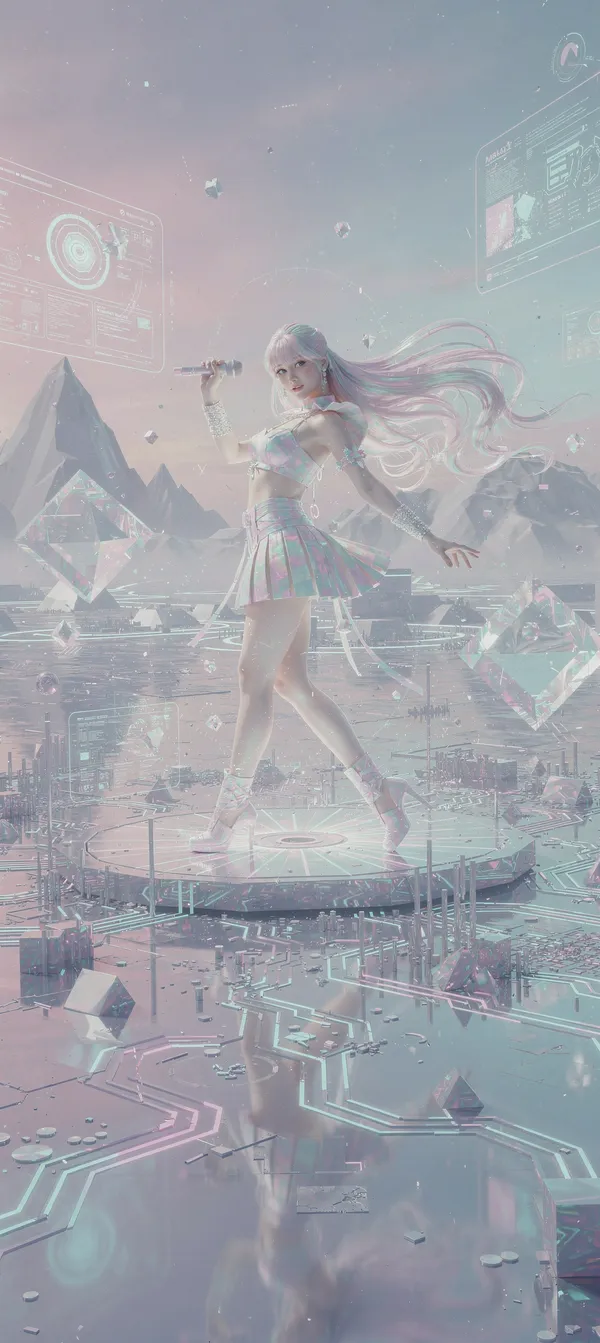 TrendingExperience a mesmerizing surreal landscape with holographic K-pop idol and geometric shapes in stunning high-resolution digital art wallpaper for smartphones.