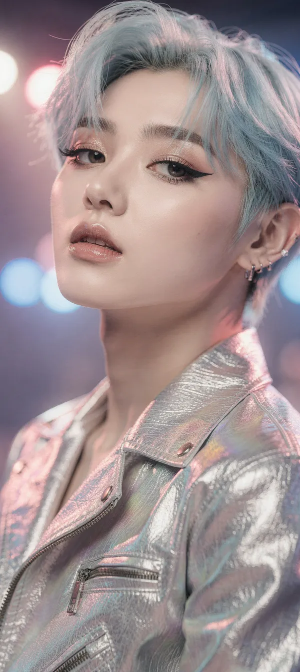 High-resolution photorealistic wallpaper featuring a K-pop star with pastel blue hair, cinematic lighting, and dramatic eye makeup for mobile screens.