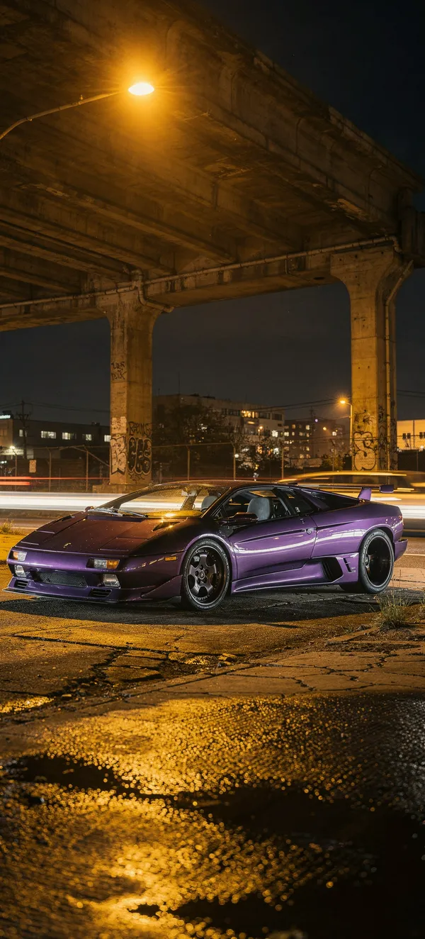 CarsHigh-resolution metallic violet Lamborghini Diablo SV wallpaper with urban night scene, sodium lights, and exotic supercar design perfect for smartphone backgrounds.