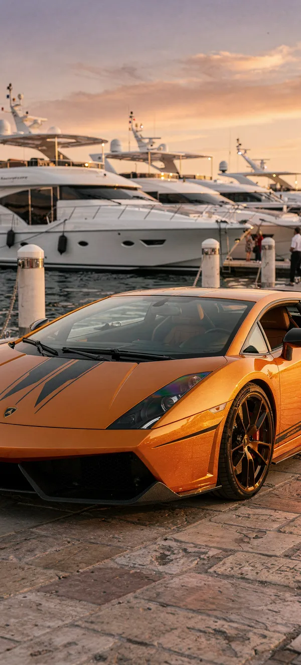 CarsHigh-resolution automotive wallpaper featuring a stunning Lamborghini Gallardo Superleggera in vibrant orange, parked elegantly at a scenic marina with sunset reflections.