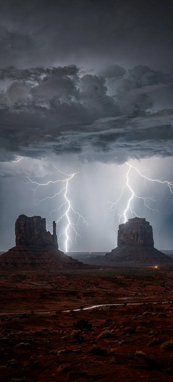 NatureExperience the electrifying beauty of Monument Valley's iconic desert landscape with this stunning 4K phone wallpaper capturing an intense lightning storm at night.