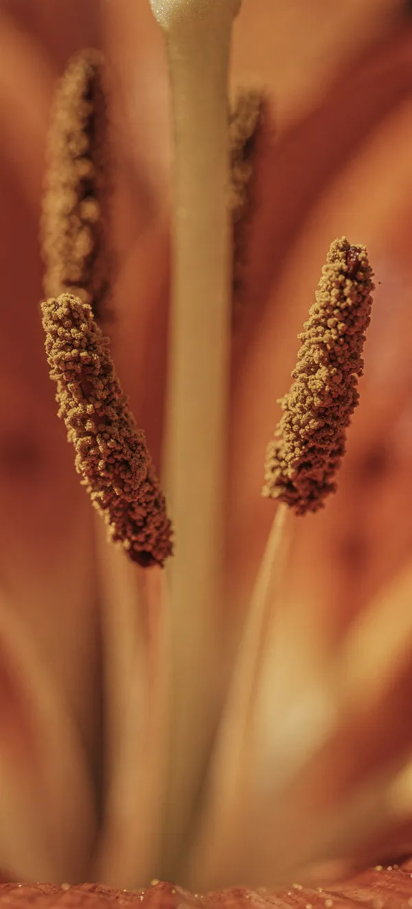 FlowersUltra-detailed botanical macro wallpaper featuring lily stamen with warm amber tones, showcasing intricate pollen details and soft blurred background in high resolution.