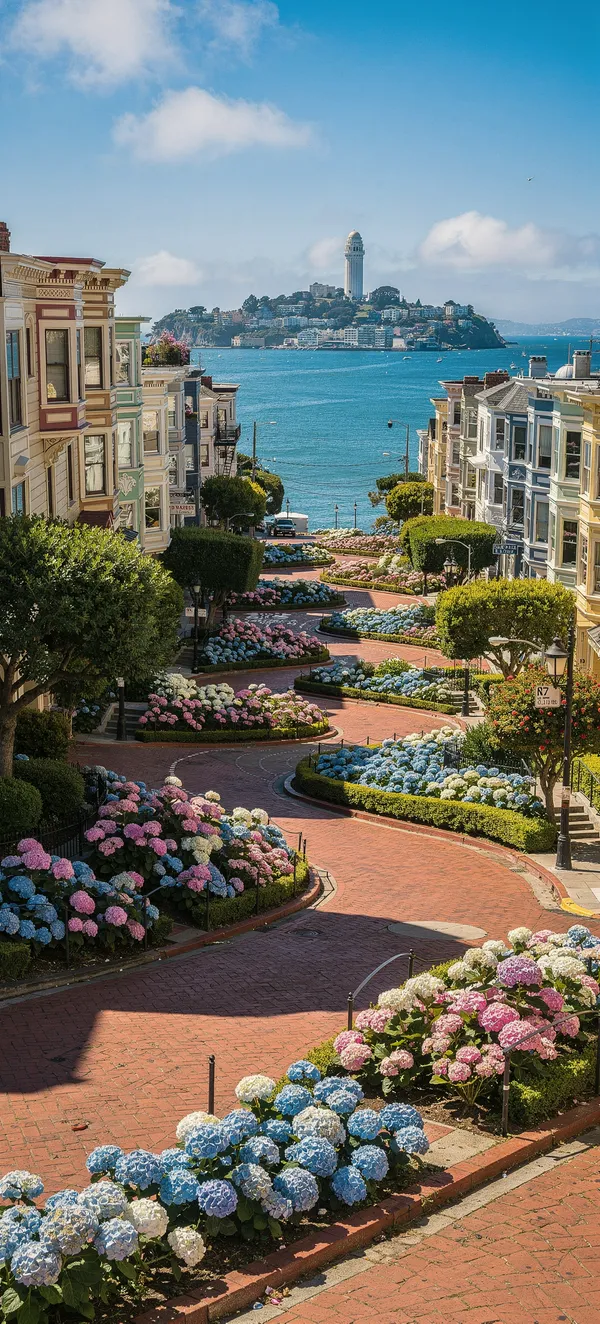CityVibrant city landscape wallpaper featuring iconic Lombard Street's zigzag turns, Victorian homes, blooming hydrangeas, and stunning San Francisco bay view in high resolution.