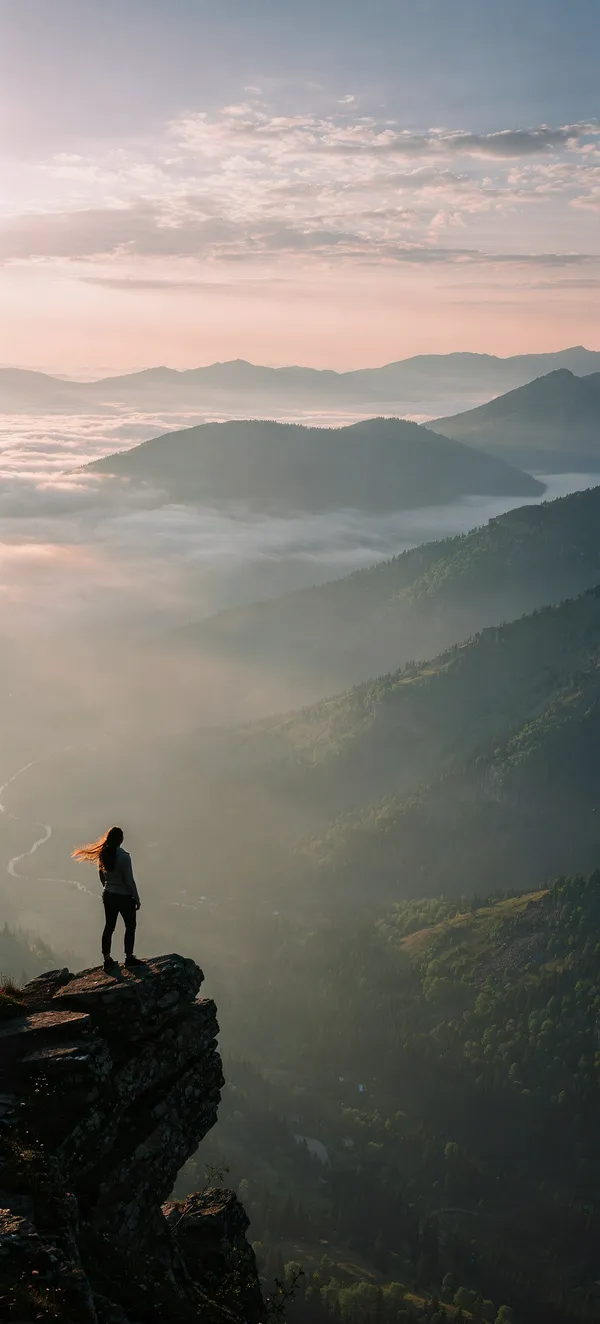 PeopleBreathtaking photorealistic wallpaper featuring a solitary woman silhouette on a mountain cliff, misty valley landscape with pink dawn sky in high-resolution detail.