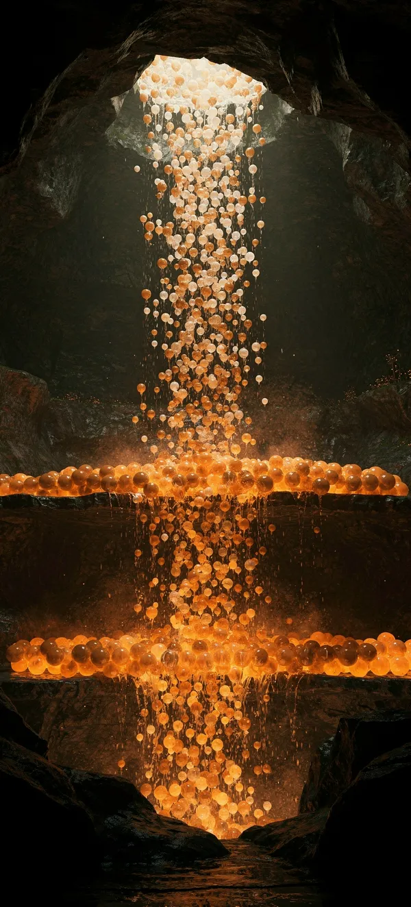 Mesmerizing vertical waterfall of luminous spheres transitioning from warm white to deep orange, creating ethereal light pools in a mystical dark environment.
