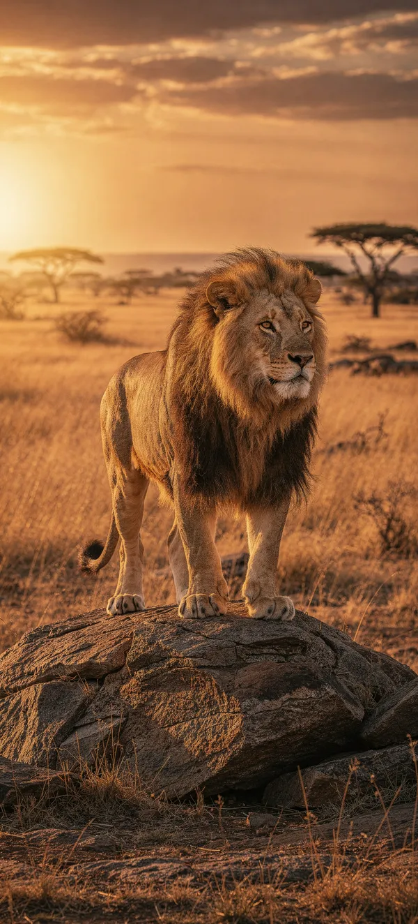 AnimalsStunning 4K lion wallpaper featuring a powerful male lion on a rocky outcrop during golden hour, with dramatic savanna landscape and warm lighting.
