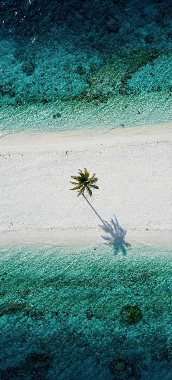 Stunning aerial view of Maldives tropical beach with turquoise waters, pristine white sand, and a lone palm tree. High-resolution mobile background for nature lovers.