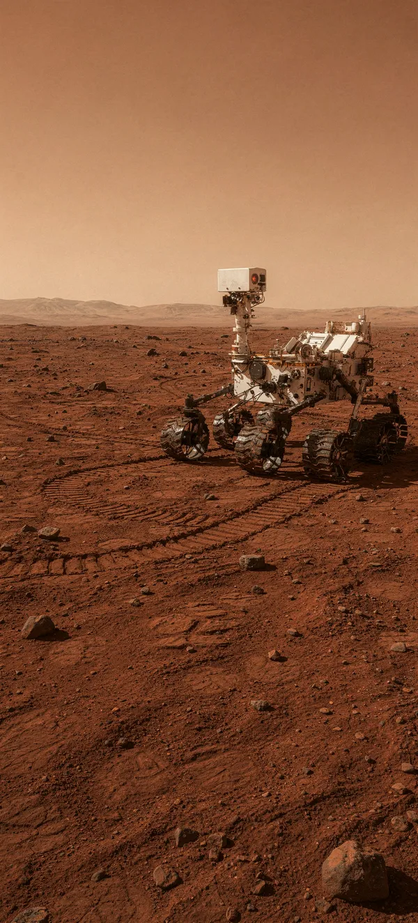 SpaceStunning photorealistic Mars rover wallpaper with dusty wheel tracks and orange hazy sky. High-quality space exploration background for your mobile device.