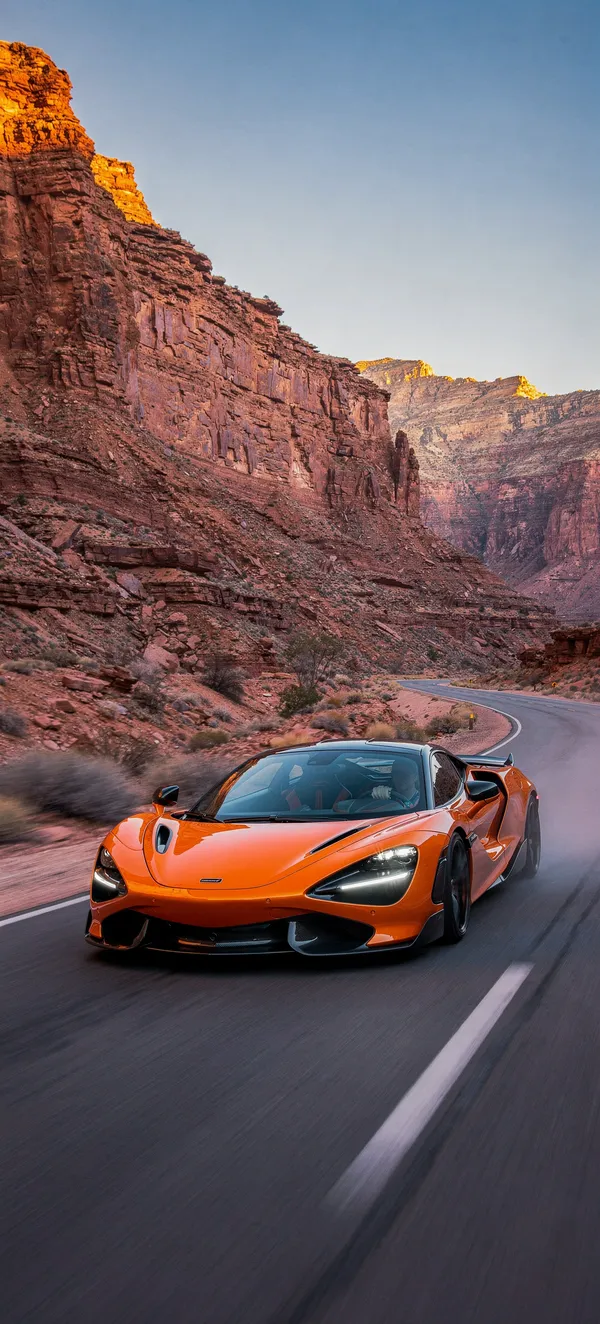 Stunning high-resolution phone wallpaper of a McLaren 765LT supercar in Papaya Spark, racing through a dramatic desert canyon at sunrise with red rock walls.