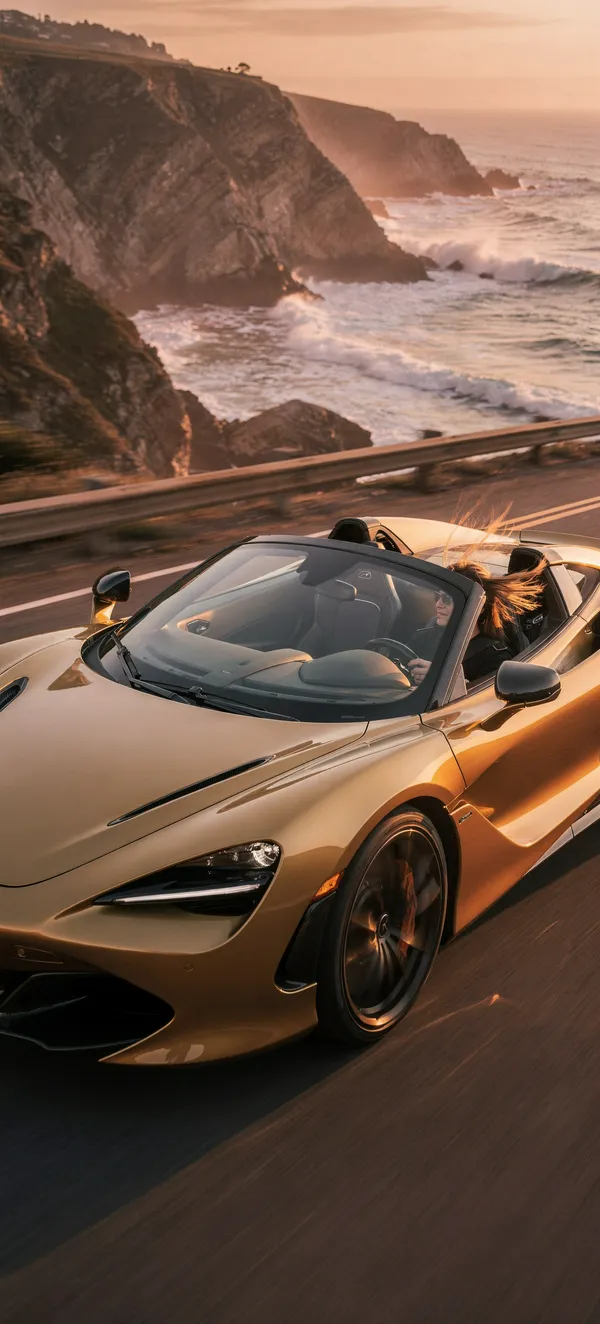 Stunning vintage gold McLaren Elva racing along coastal road at golden sunset. High-resolution supercar wallpaper capturing speed, freedom, and automotive elegance.