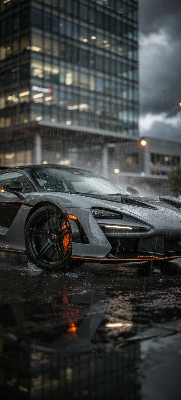 CarsUltra-detailed McLaren Senna in stunning grey, wet reflections and dramatic urban backdrop. High-resolution automotive phone wallpaper for supercar enthusiasts.