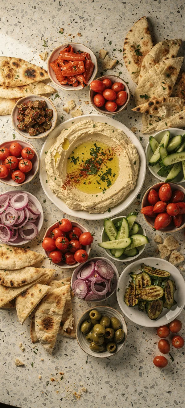 FoodVibrant overhead photo of colorful Mediterranean feast with hummus, pita, fresh vegetables on stylish terrazzo background. High-resolution food wallpaper.