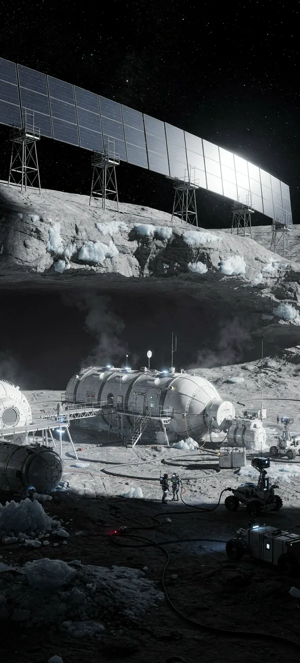 SpaceStunning sci-fi wallpaper of an astronaut base camp on Mercury's north pole, featuring solar panels and dramatic temperature contrasts in realistic space landscape.