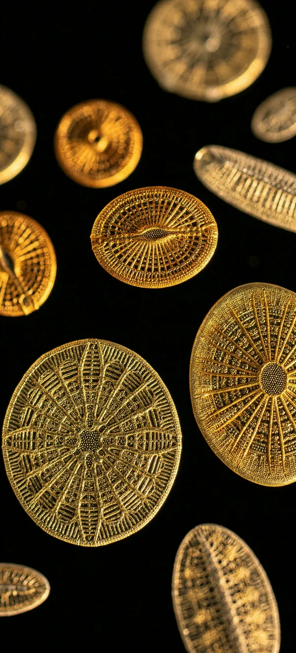 AbstractStunning high-resolution phone wallpaper featuring intricate microscopic diatom shell designs in golden hues, with complex geometric patterns and elegant scientific artistry.