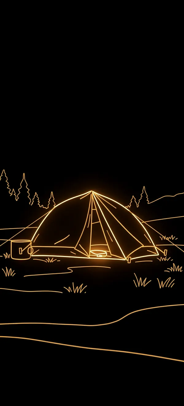 Dark / AMOLEDUltra-minimal dark AMOLED wallpaper featuring a warm amber neon tent outline against pure black background. Perfect wilderness adventure phone background in high-contrast design.