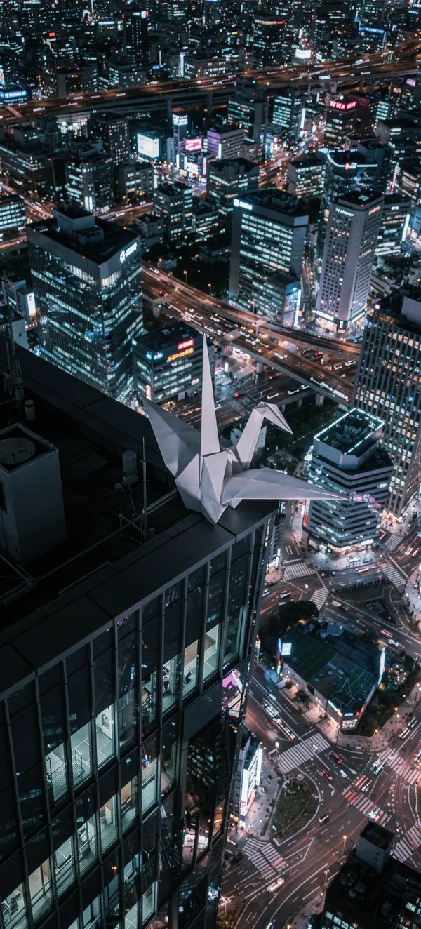 MinimalUltra-crisp minimalist phone wallpaper featuring an origami crane above a stunning Tokyo nightscape with geometric urban design and vibrant neon colors.