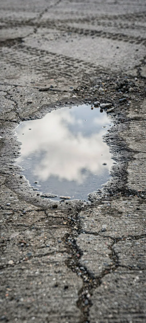 Minimalist landscape wallpaper featuring pale sky reflected in concrete puddle. Industrial urban aesthetic with serene atmospheric detail for phone backgrounds.