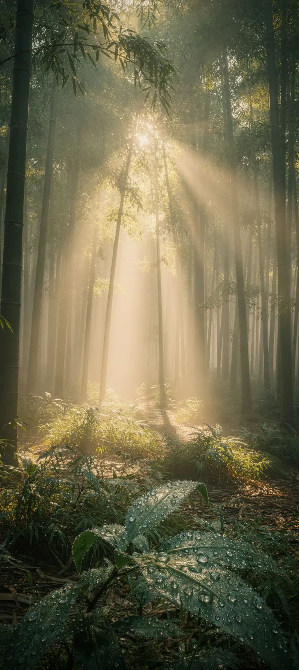 Serene nature wallpaper featuring golden sunlight piercing through misty emerald bamboo forest. High-resolution, tranquil landscape for mobile backgrounds.