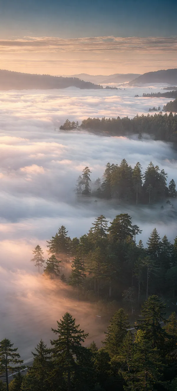 Breathtaking Pacific Northwest landscape wallpaper featuring golden sunrise light and dense fog rolling through coastal redwood valley, stunning high-resolution nature scene.