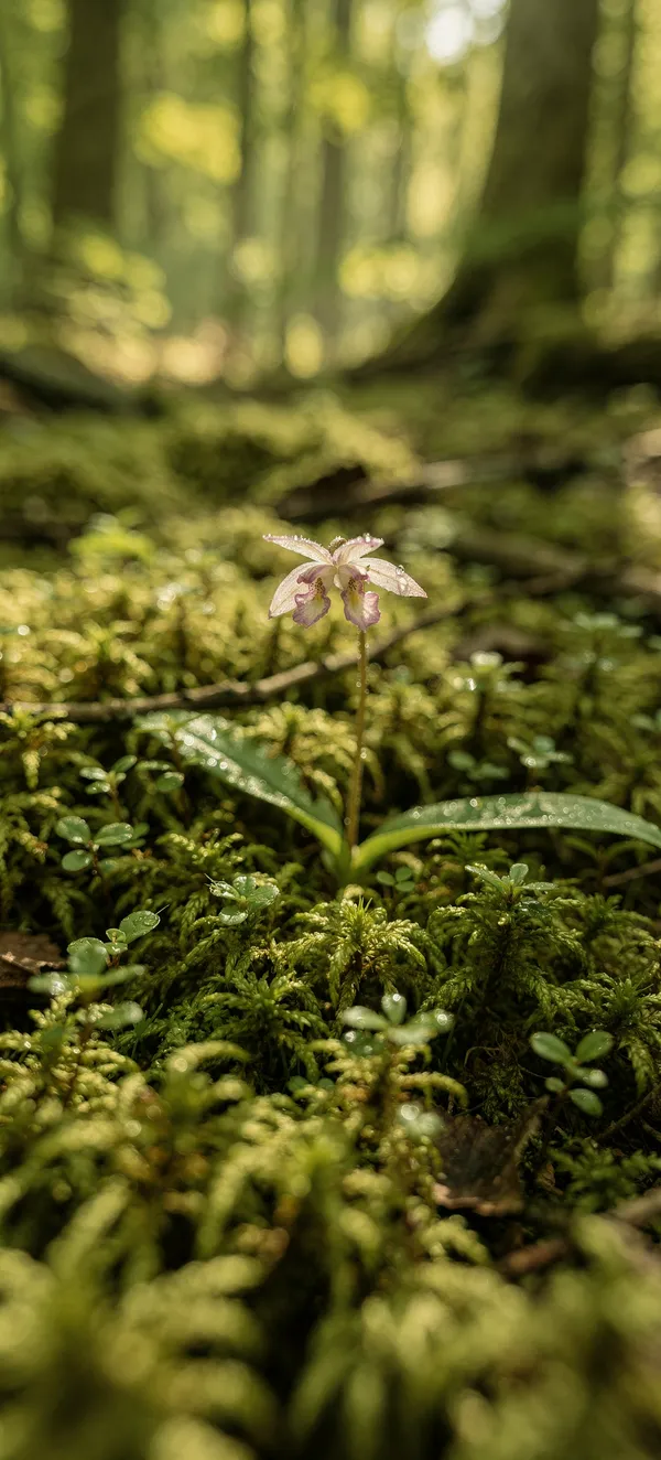 FlowersImmerse your phone in a breathtaking miniature botanical world with this high-resolution macro wallpaper featuring a delicate wild orchid nestled in lush moss.