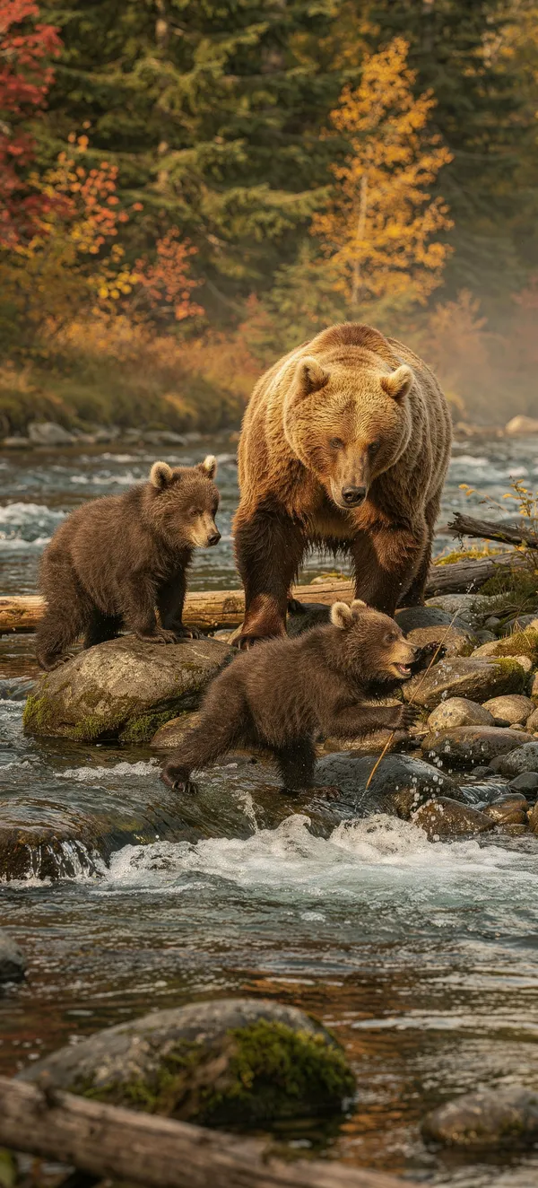 Stunning wildlife wallpaper of mother bear teaching cubs to fish in Pacific Northwest forest. High-resolution nature scene for mobile backgrounds.
