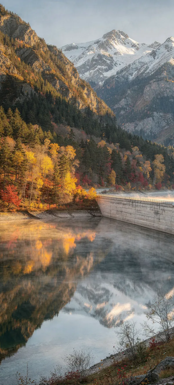 NatureBreathtaking autumn landscape wallpaper featuring misty mountain reservoir reflecting colorful forest and snow peaks, perfect high-resolution nature background.