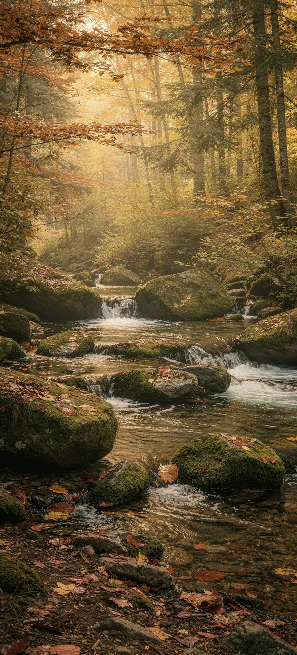 NatureImmersive nature wallpaper featuring a serene mountain stream with moss-covered rocks, golden leaves, and warm afternoon light. High-quality HD landscape background.