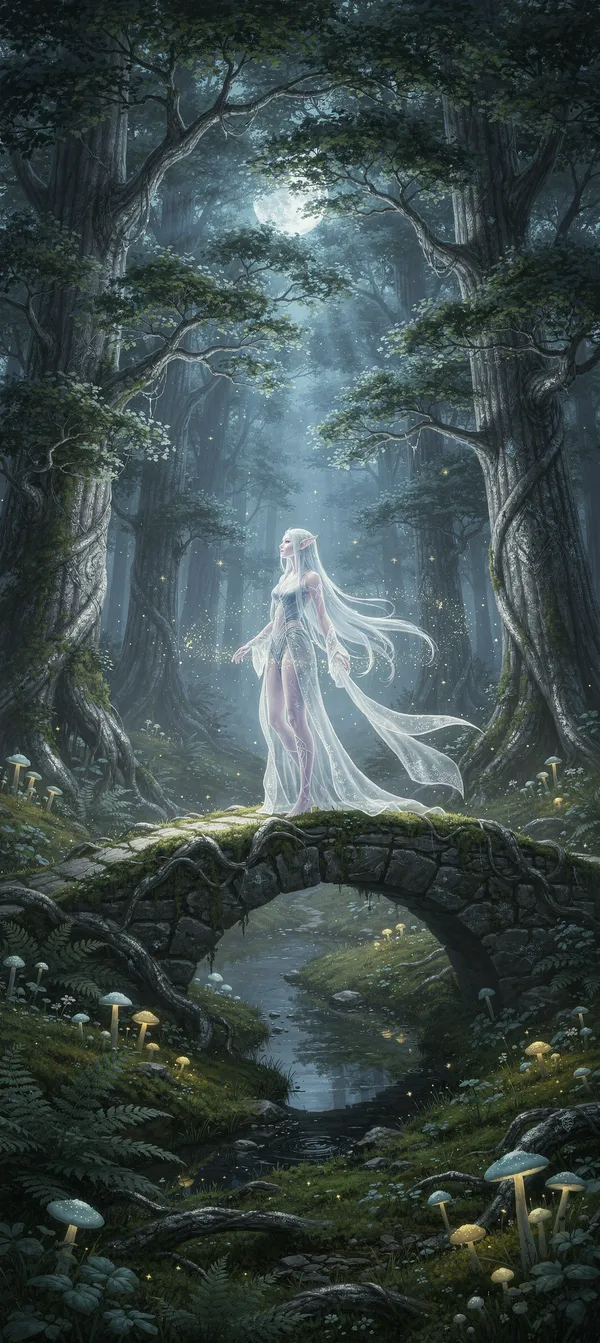 Immersive fantasy phone wallpaper featuring a misty elven forest at twilight with silver trees, magical particles, and luminous moonlight. High-quality 4K fantasy art.