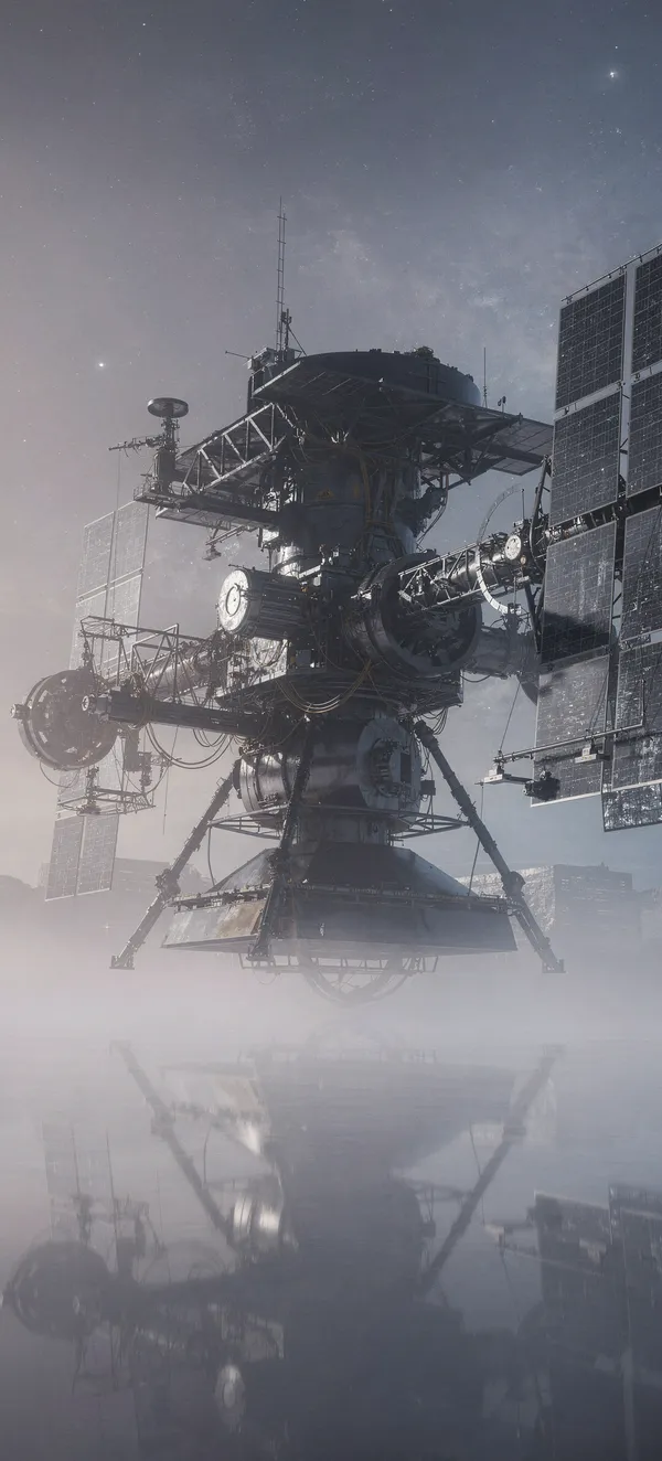 SpaceUltra-detailed NASA-inspired space satellite wallpaper with ethereal fog and lavender cosmic background. High-resolution 9:16 vertical mobile wallpaper for tech enthusiasts.