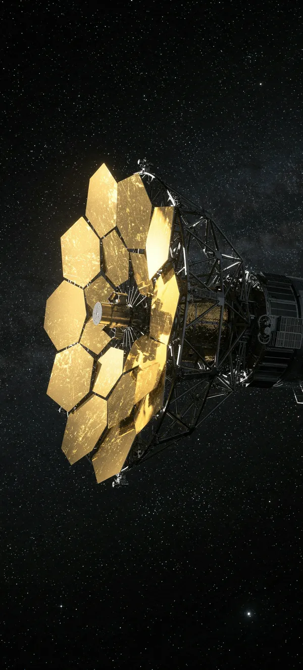 SpaceUltra-realistic NASA space telescope wallpaper with golden mirror panels against a stunning starry black cosmic background. Perfect HD space wallpaper for phone.