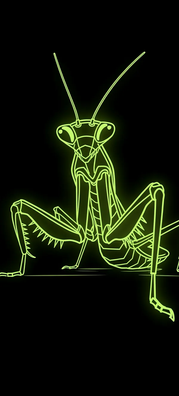 Dark / AMOLEDUltra-dark minimalist wallpaper featuring a glowing lime green geometric praying mantis outline on pure black background, perfect for AMOLED screens.