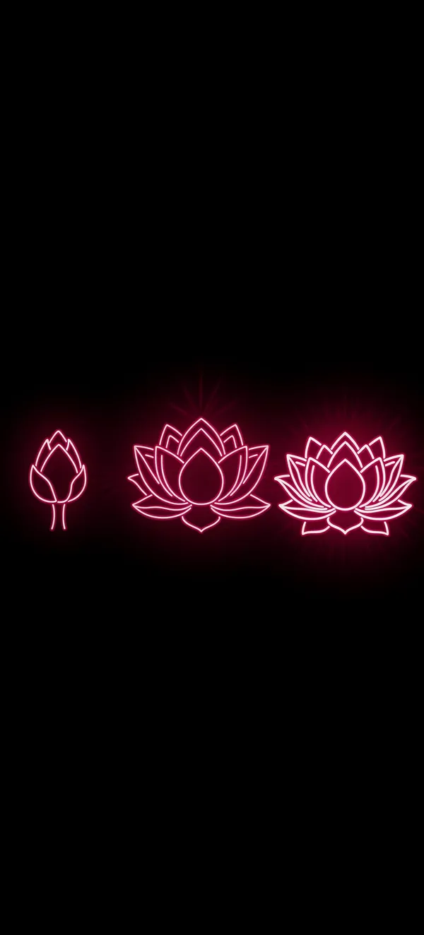Dark / AMOLEDStunning AMOLED dark wallpaper featuring minimalist neon lotus flowers in progressive bloom stages, elegant pink gradient design perfect for zen-inspired screens.