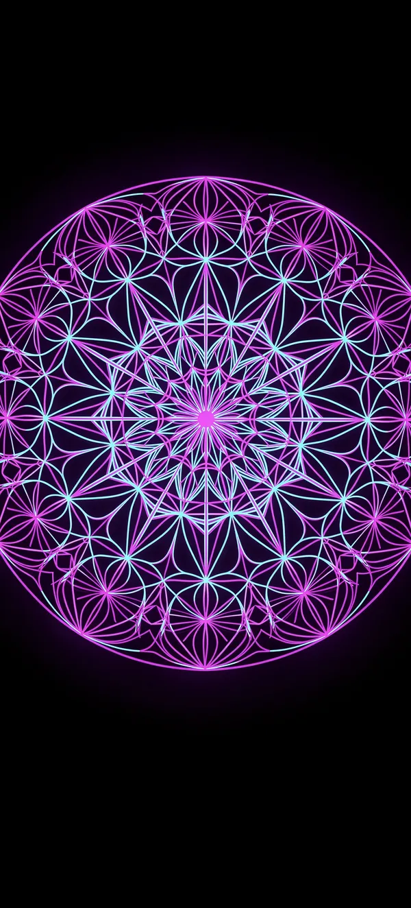 Dark / AMOLEDUltra-crisp dark geometric mandala wallpaper with vibrant purple and cyan neon lines. Perfect AMOLED background featuring sacred symmetry design in high resolution.