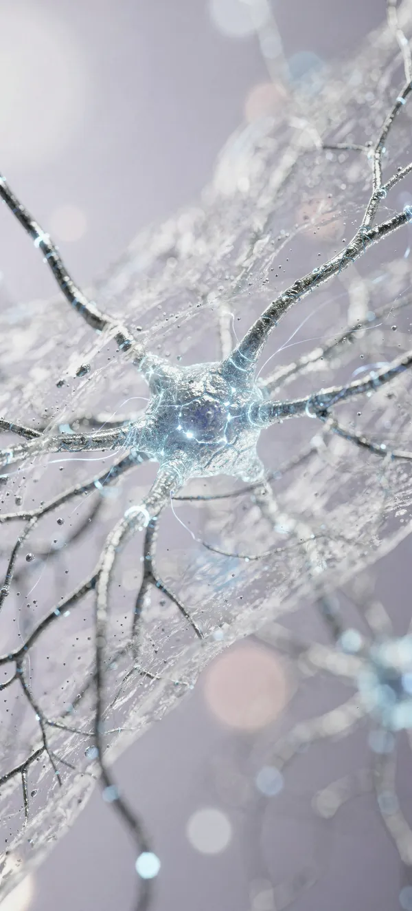AbstractUltra-detailed microscopic brain synapse wallpaper with ethereal blue and silver connections, perfect high-resolution abstract background for modern smartphones.