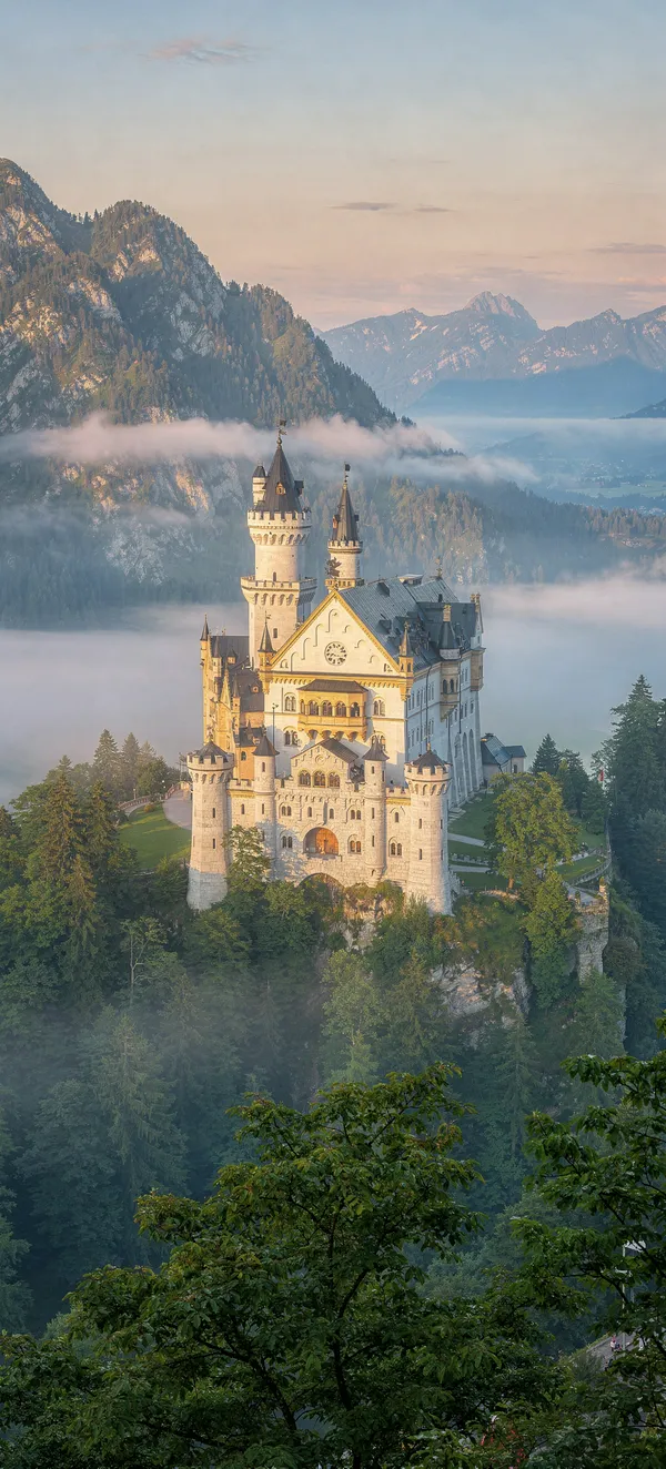 ArchitectureStunning photorealistic wallpaper of Neuschwanstein Castle nestled in misty German mountain landscape. High-resolution architectural phone background.