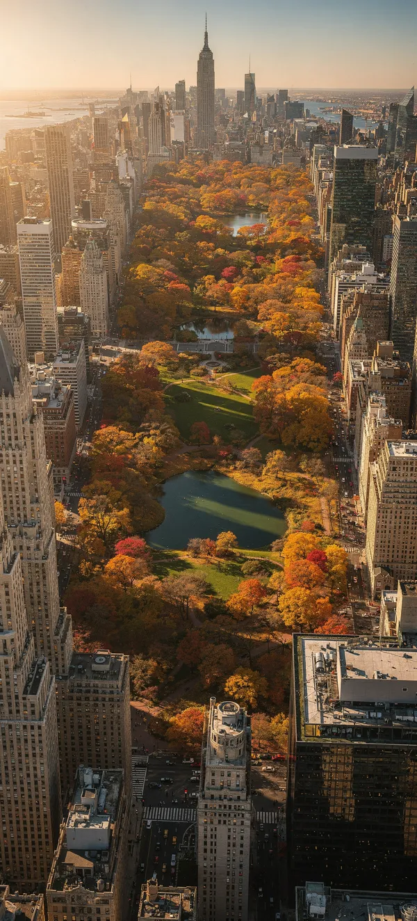 CityStunning aerial view of Central Park's fall foliage surrounded by NYC skyscrapers, capturing the vibrant contrast between urban landscape and natural beauty in high-resolution.