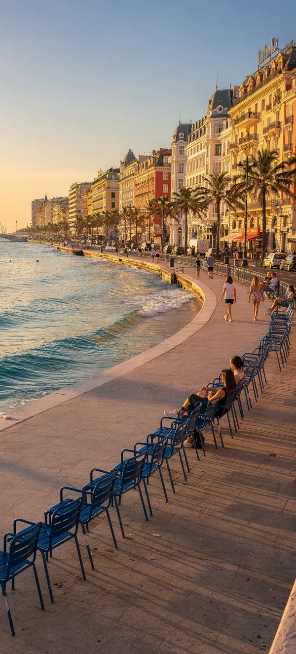 CityStunning French Riviera landscape wallpaper featuring Promenade des Anglais at golden hour with azure sea, blue chairs, and elegant belle époque architecture.
