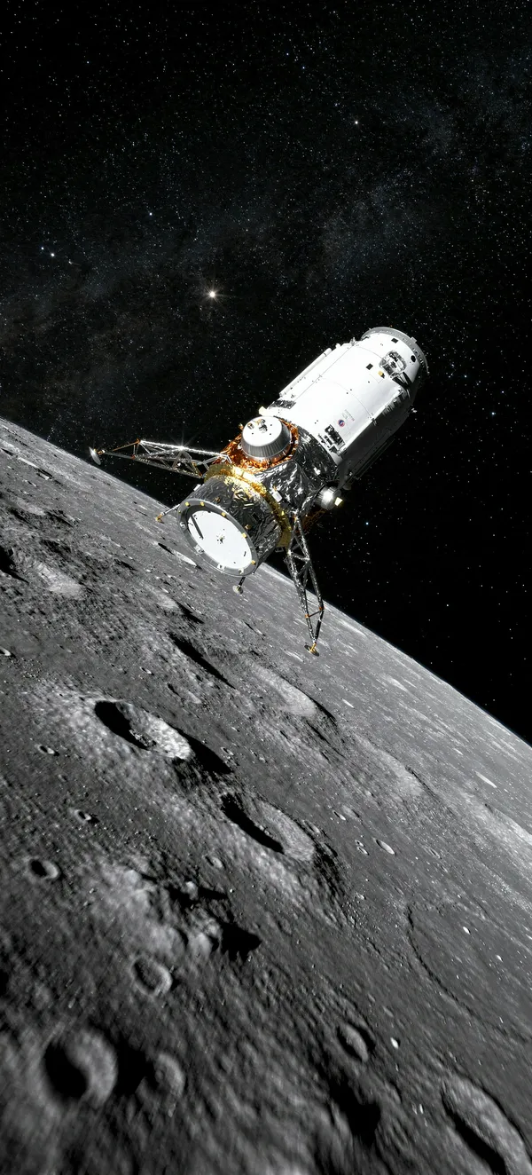 SpaceStunning photorealistic space wallpaper featuring Orion spacecraft performing dramatic lunar flyby with detailed moon surface and starry background.