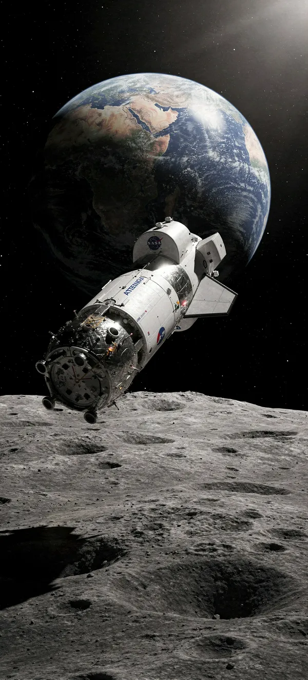 Stunning photorealistic wallpaper of Orion spacecraft orbiting the Moon with Earth rising, cinematic deep space scene from NASA's Artemis mission.