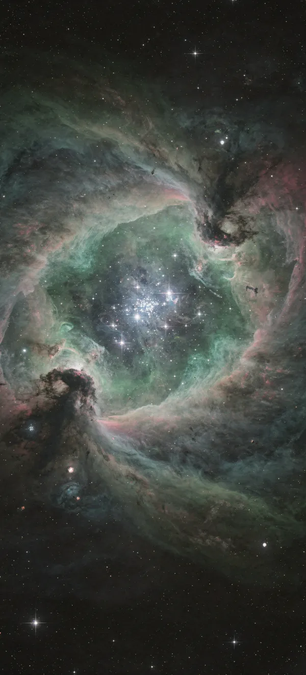 SpaceImmersive cosmic landscape featuring detailed Orion Nebula with vibrant green, teal, and magenta hues. High-resolution astronomy wallpaper for smartphone.