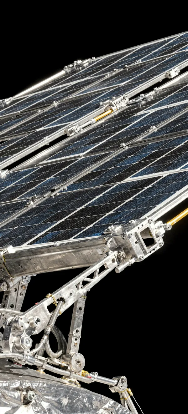 SpaceStunning high-resolution space wallpaper featuring detailed Orion service module solar panels in deep black cosmic background. Perfect sci-fi phone background.