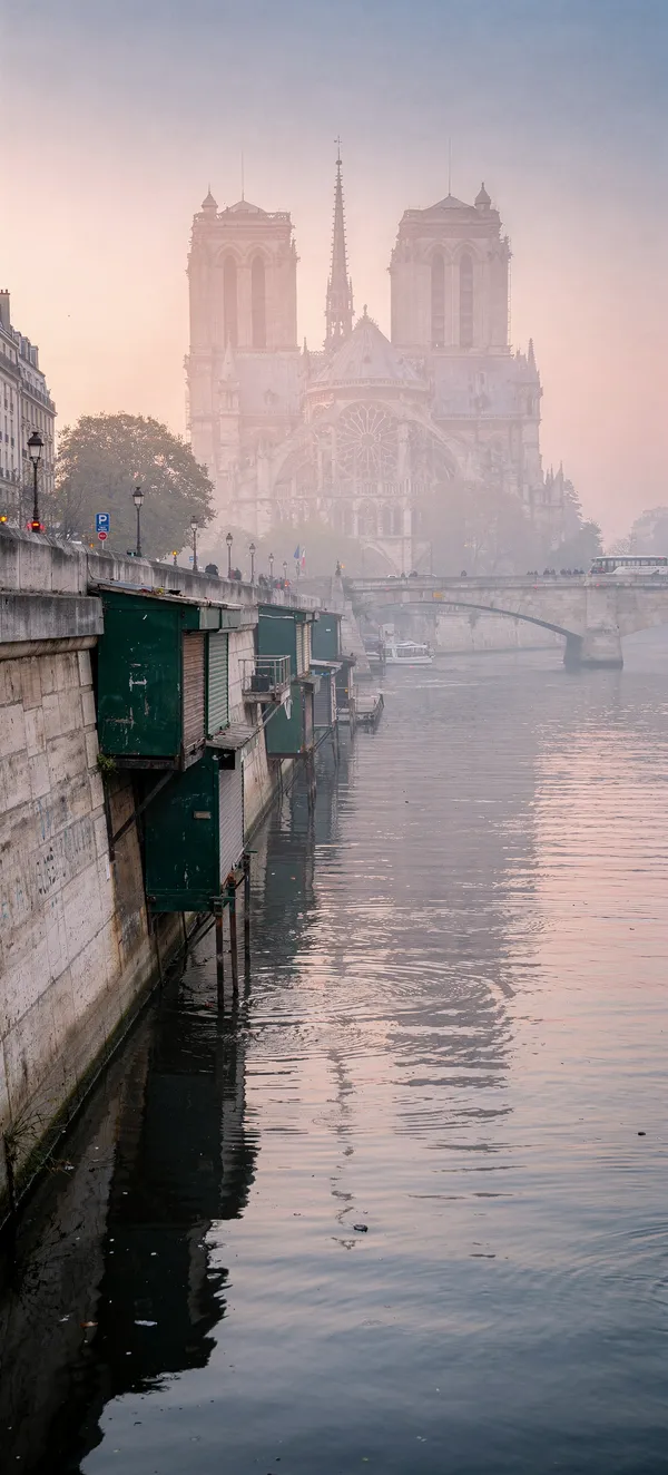 CityStunning realistic dawn photography of Paris Seine riverbank with Notre-Dame silhouette, soft pink light, and empty stone embankment. High-quality urban landscape wallpaper.