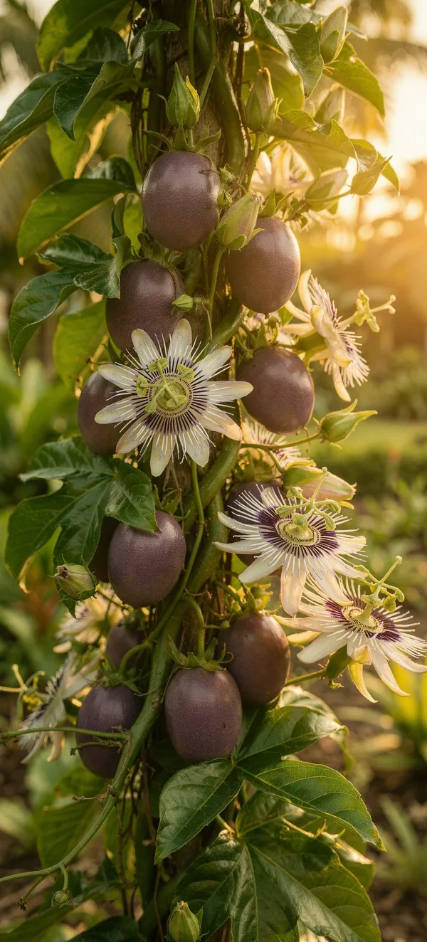 FlowersStunning tropical wallpaper featuring lush passion fruit vine with vibrant purple fruits and delicate open flowers in warm garden light. HD nature background.