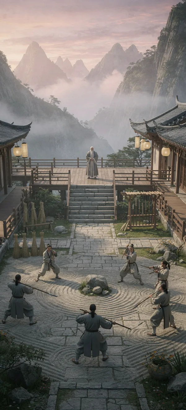 GamingSerene martial arts monastery wallpaper with misty mountains, sunrise, meditation garden, and training courtyard. High-quality digital art for gamers and fighting game fans.