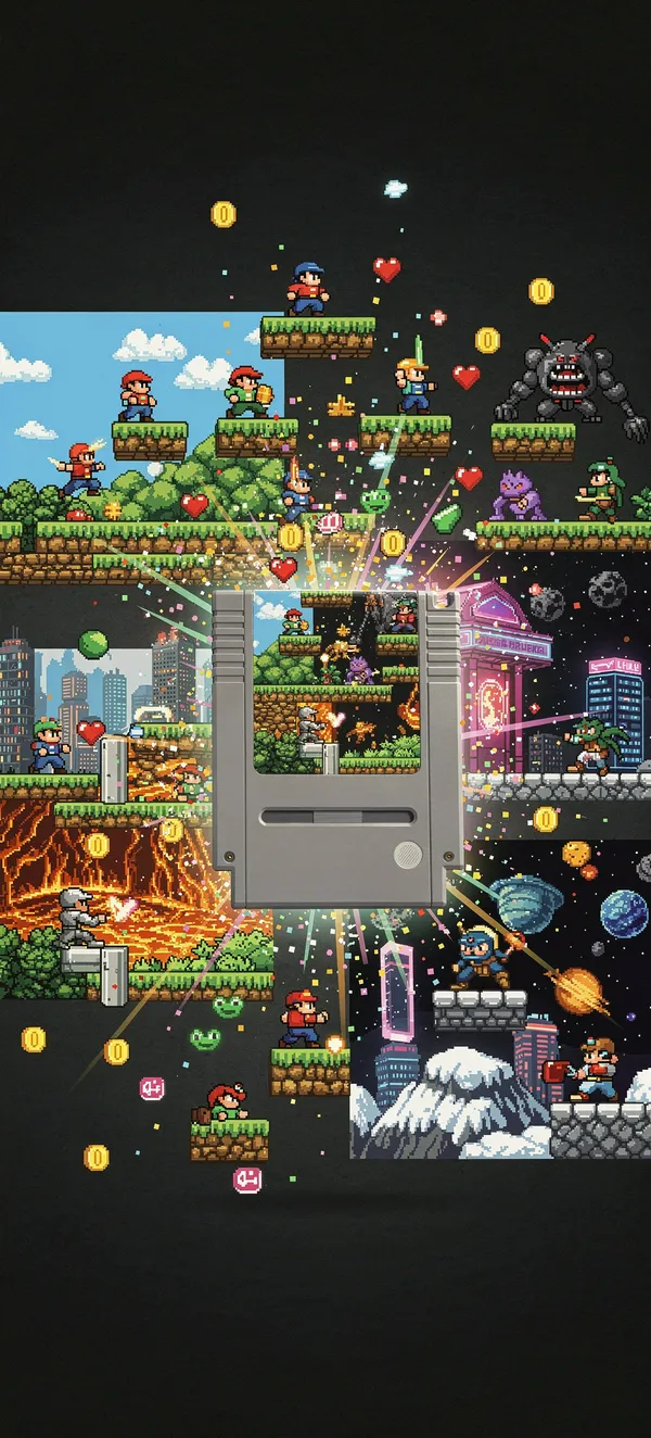 GamingVibrant pixel art wallpaper featuring an epic retro game cartridge bursting with nostalgic video game characters, landscapes, and power-ups in stunning HD detail.